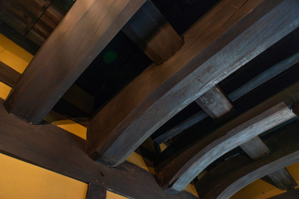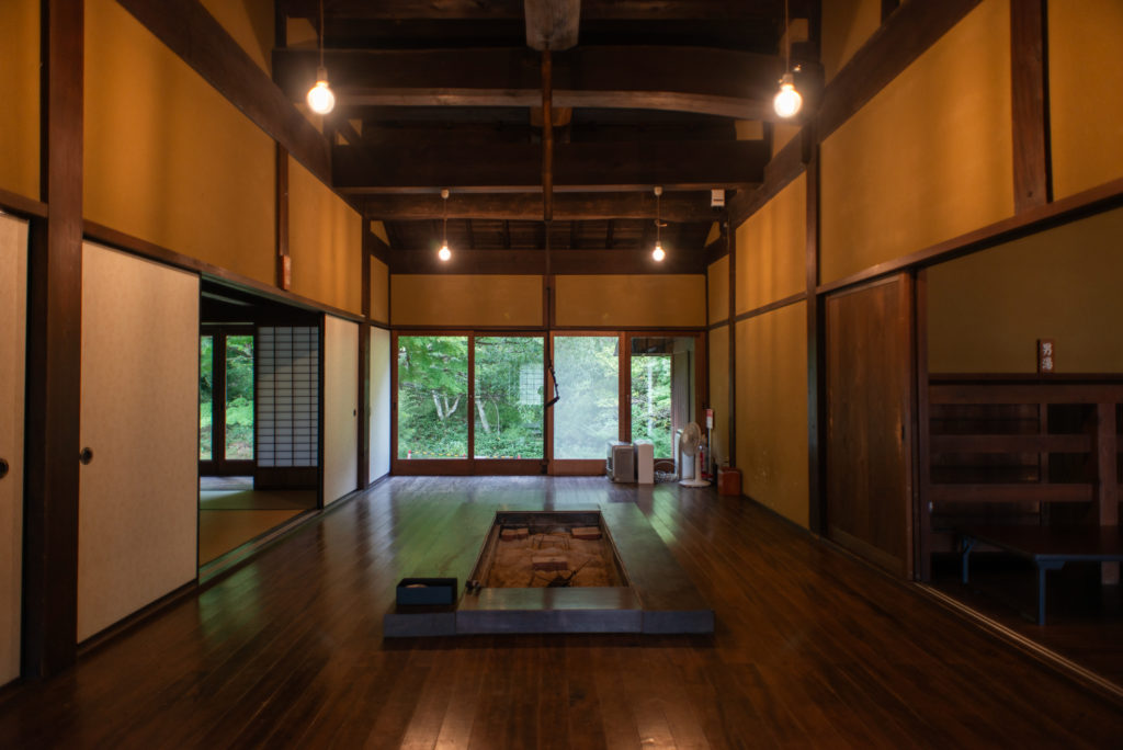 古民家・桑田は築200年以上の古民家を移築して建てられた、弥栄の歴史を知る建物です。見たこともないような大きく立派な梁は、本当に圧巻です。窓からは自然の景色を眺められ、非日常の始まりを感じていただけます。