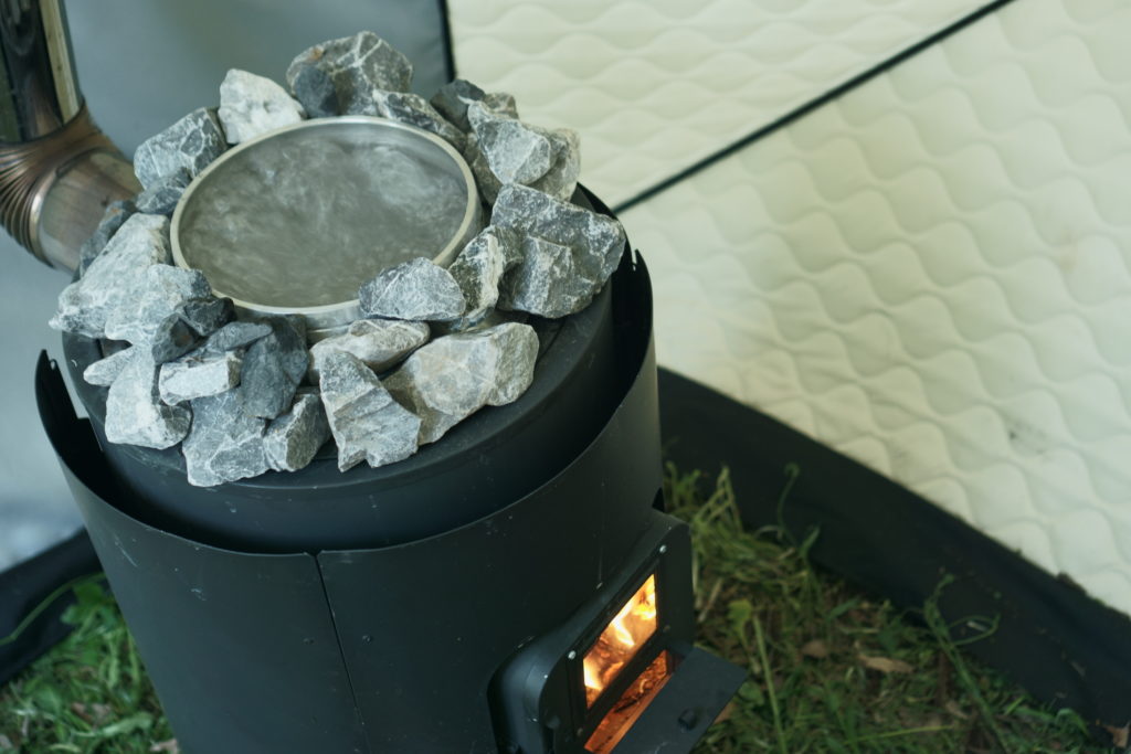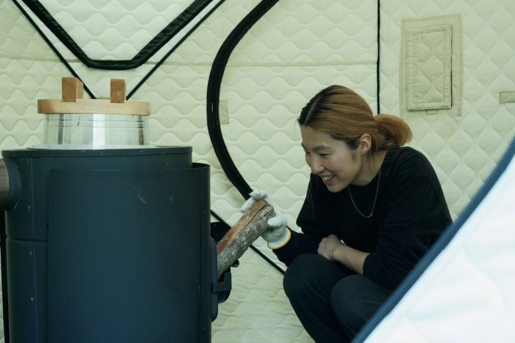 チェックイン後、お部屋で少し休憩したあとはテントサウナの準備です。薪を用意して、薪に火をつけます。薪に火がついてから30分程度で室温が50〜70℃になります。(場合によってはスタッフが薪の用意から着火まで行います)